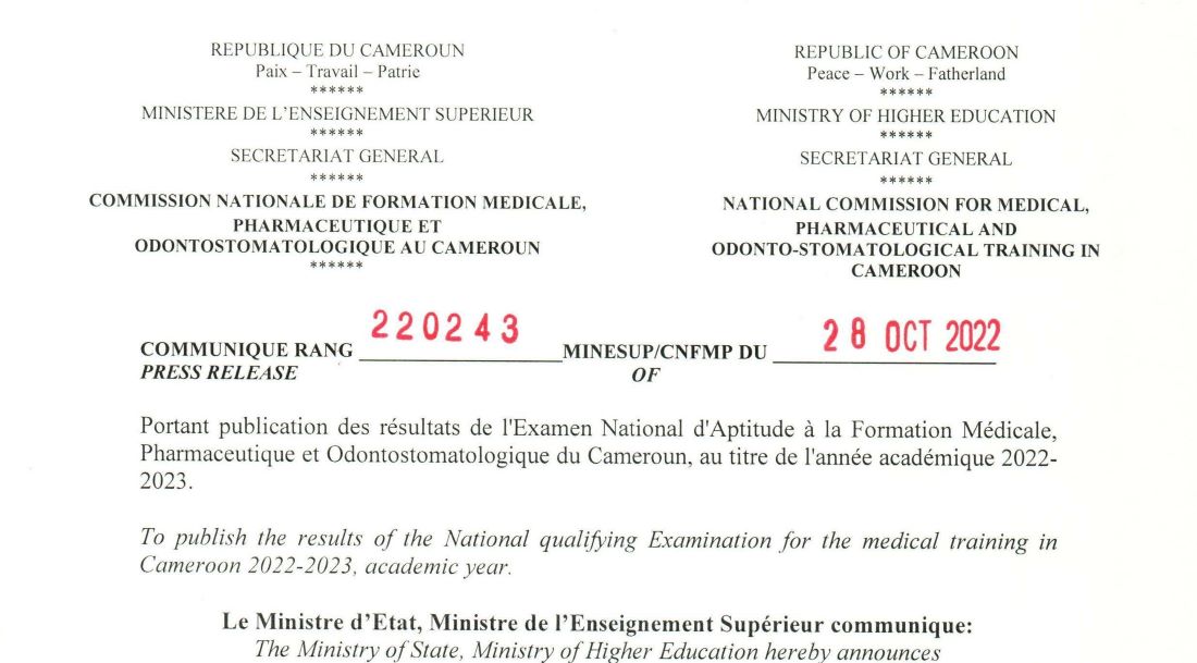 Press release to publish the results of the National qualifying Examination for the medical training in Cameroon 2022-2023, academic year. Le Ministre d’Etat, Ministre de l’Enseignement Supérieur communique: The Ministry ofState, Ministry ofHigher Education