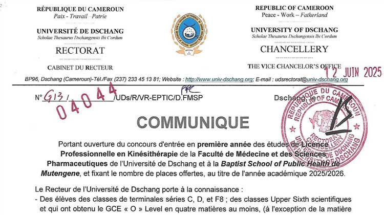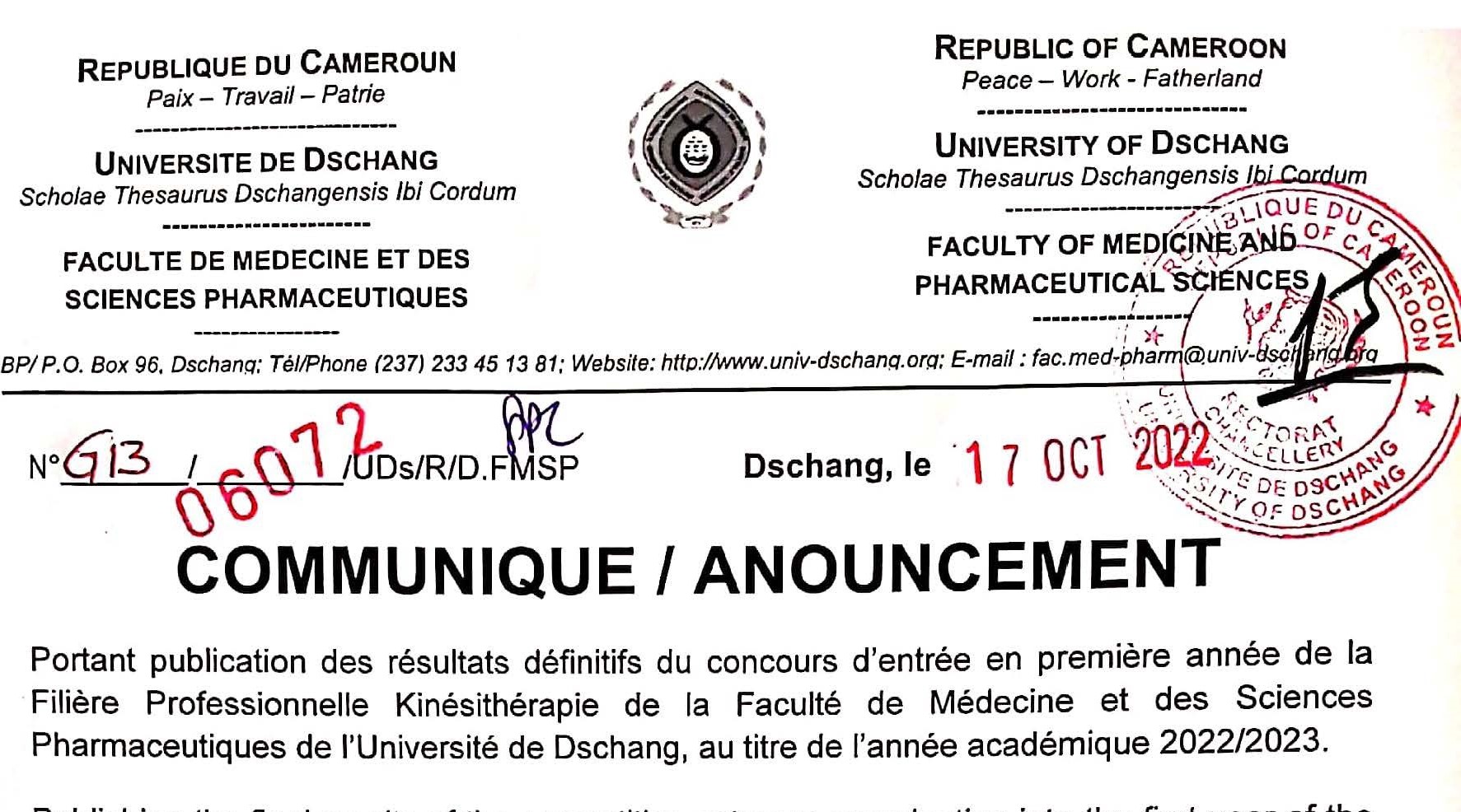 COMMUNIQUE/ANNOUNCEMENT Le Doyen de la Faculté de Médecine et des Sciences Pharmaceutiques de l’Université de Dschang informe les candidats au concours d’entrée en 1ère année de la filière Professionnelle Kinésithérapie, qui aura lieu le